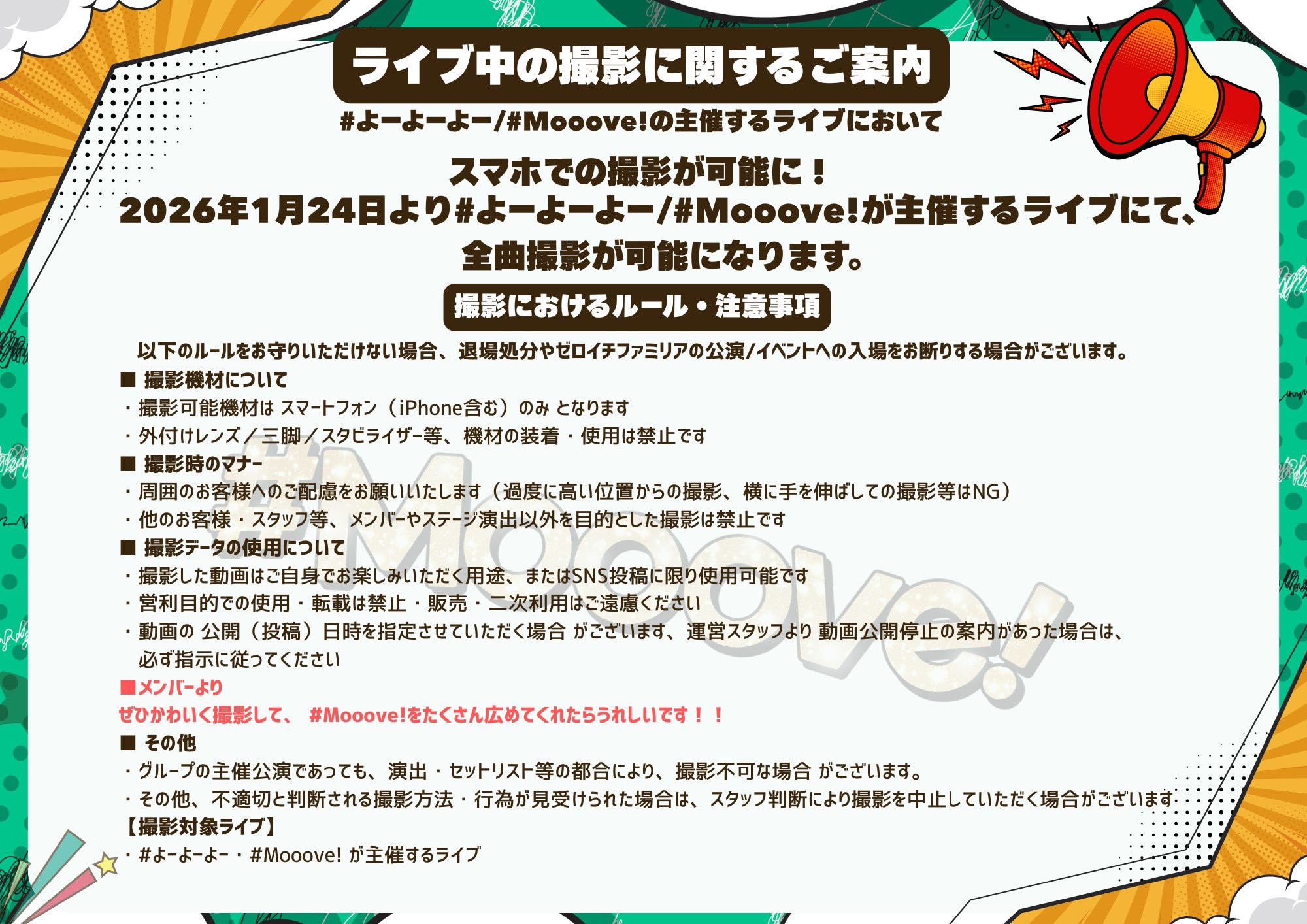 2026/1/24(土)から #よーよーよー 主催公演においてスマホでの全曲撮影が可能になります🌈