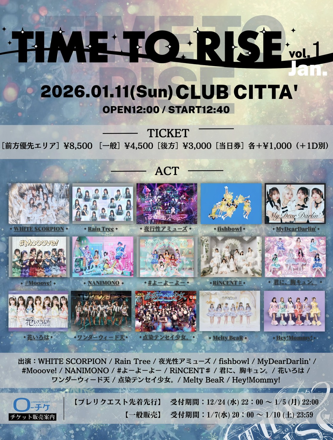 前方優先エリア8,500円 / 一般4,500円 / 後方 3,000円 / 当日各+1,000円(ドリンク別)